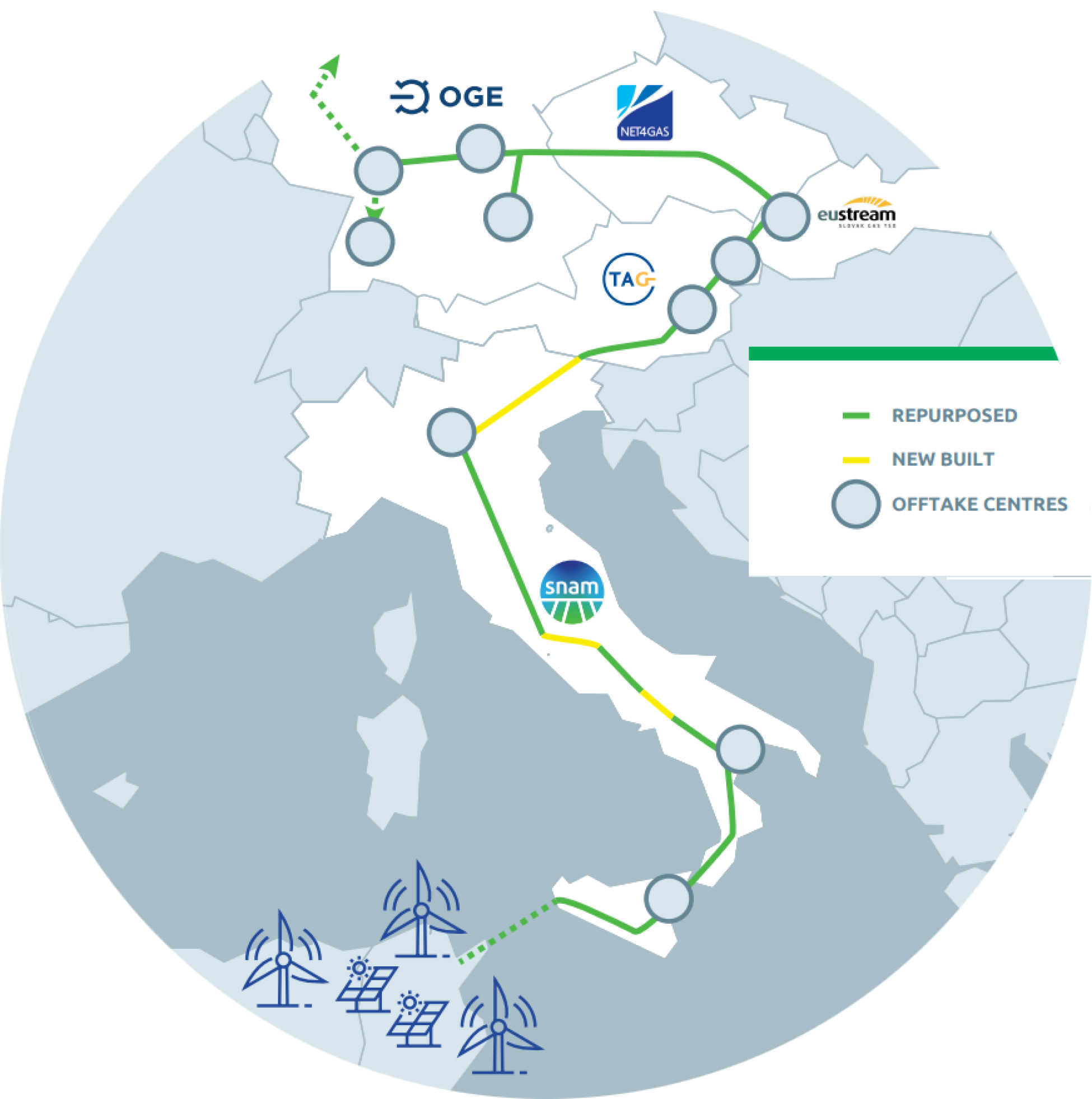 Projekt se soustředí na zajištění dodávek zeleného vodíku ze severní Afriky v množství 290 GWh za den až do středního Německa. Trasa o délce 3400 km povede částečně v novém potrubí a částečně v již existující síti tranzitních plynovodů. Naším cílem je diverzifikovat zdroje energie.